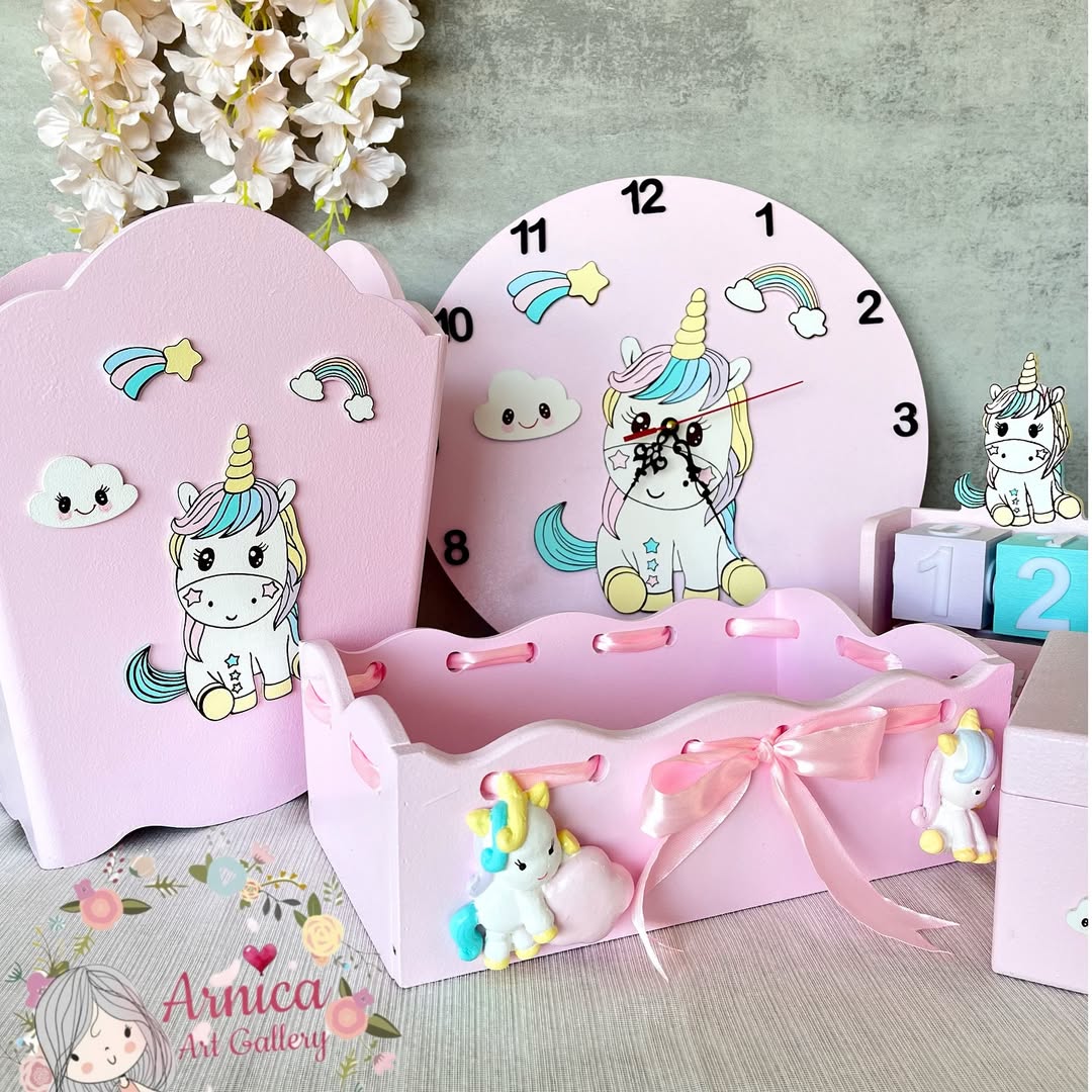 ساعت سطل جعبه و استند سونوگرافی چوبی اتاق کودک تم یونیکورن