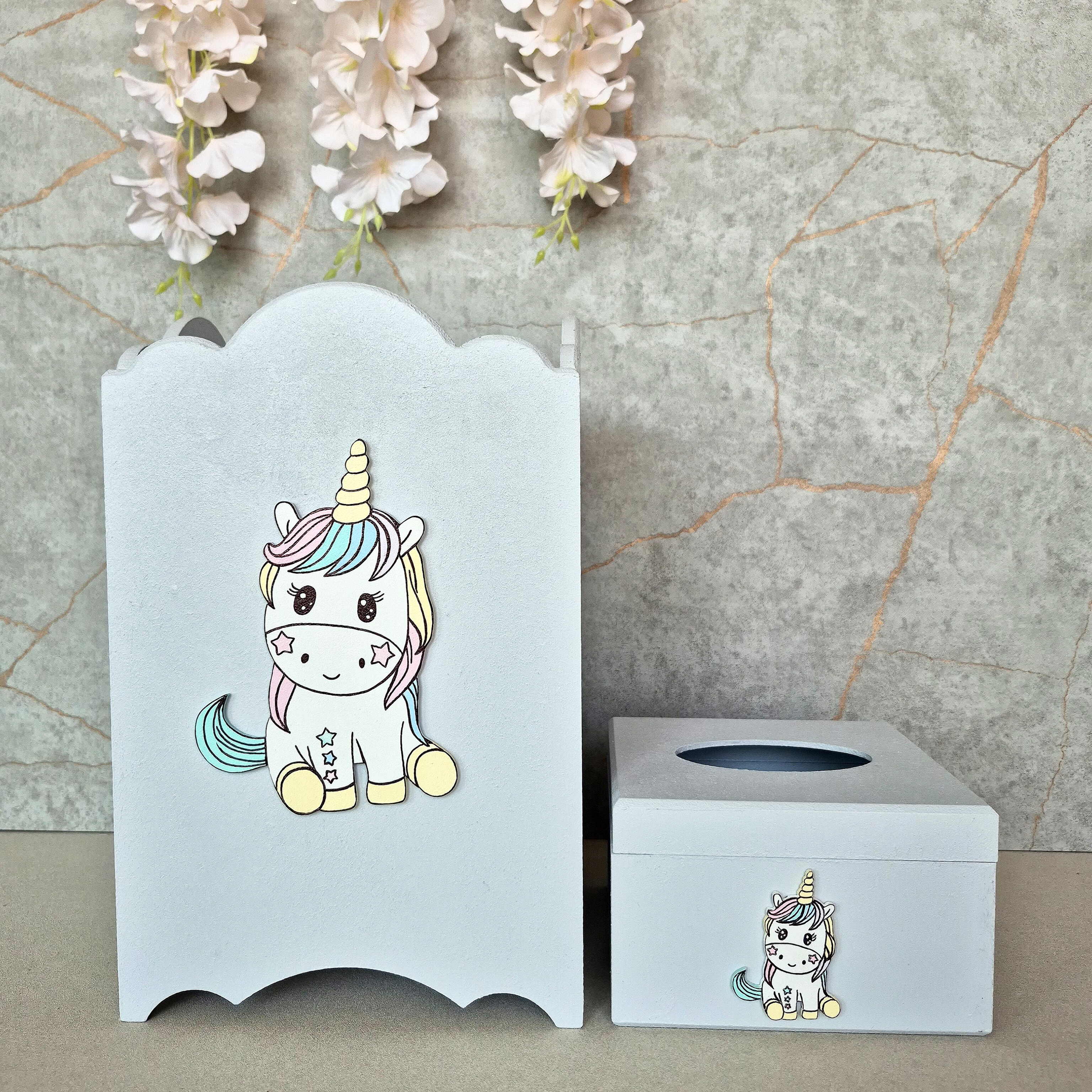 ست کامل چوبی تم یونیکورن شامل ساعت، سطل، جعبه دستمال و استند سونوگرافی، اکسسوری کامل و رویایی برای اتاق کودک دخترانه است. این ست با طراحی یونیکورن و رنگهای پاستلی، فضایی جادویی به اتاق کوچولویتان میبخشد.